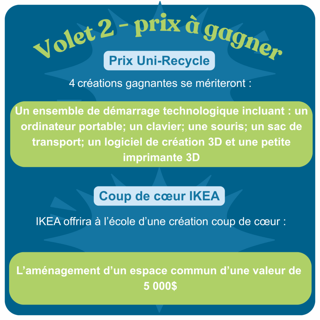 Grâce à nos partenaires Groupe TVA, IKEA et Uni-Recycle, les élèves peuvent remporter des prix exceptionnels qui encouragent leur créativité et leur intérêt pour les TIC.