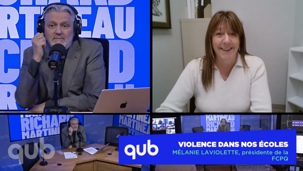 J’ai d’ailleurs parlé de la responsabilité des parents dans la prévention de la violence au micro de Richard Martineau à QUB radio, pendant la Semaine de la prévention de la violence et de l’intimidation dans les écoles.Un des nombreux constats qui m’ont frappée dans les résultats de notre enquête nationale sur le bien-être des familles québécoises est que 10% des parents rapportent que leur enfant subit de l’intimidation ou de la discrimination fréquemment à l’école. 57% des parents disent que leur enfant a déjà vécu une expérience d’intimidation ou de discrimination. Il y a du travail à faire, et nous pouvons tous contribuer à la solution en étant des exemples de respect et de civilité pour nos enfants.