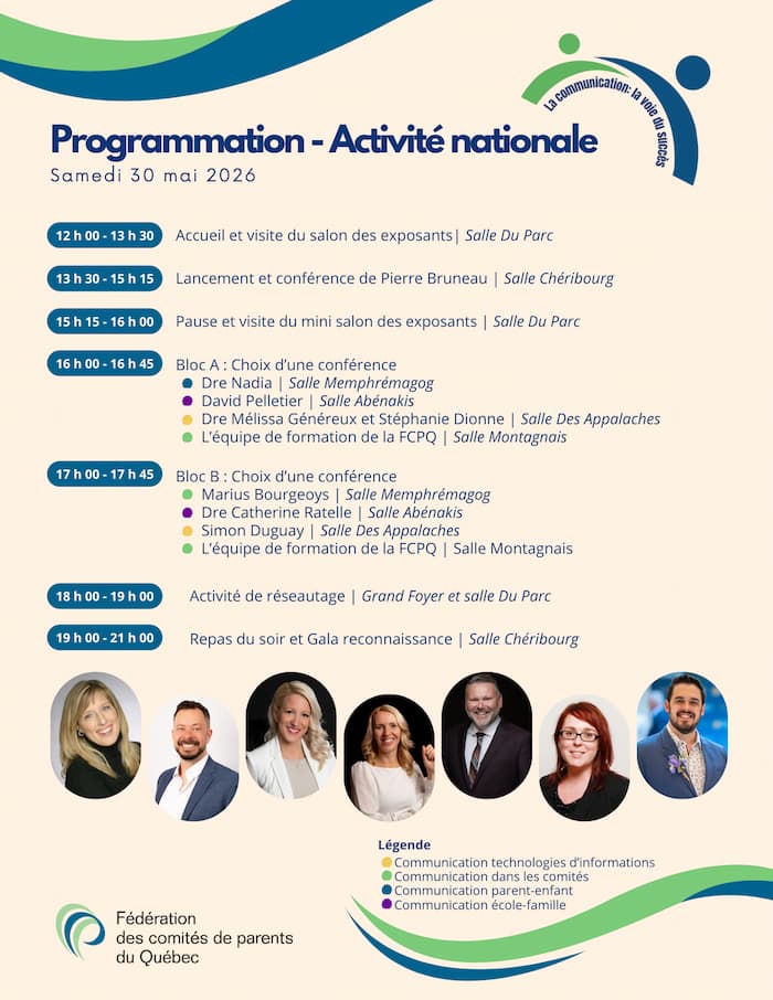 Parce que la communication dans et entre les instances de gouvernance scolaire, c’est la voie du succès. Lorraine Doucet, Benoît Champagne, Rénald Beauchesne, Nancy Boone et Lorraine Normand-Charbonneau seront présents lors de l’Activité nationale pour animer une conférence! Ce sera le moment parfait pour échanger, poser toutes ces questions qui vous trottent dans la tête et pour en apprendre plus sur votre implication parentale.