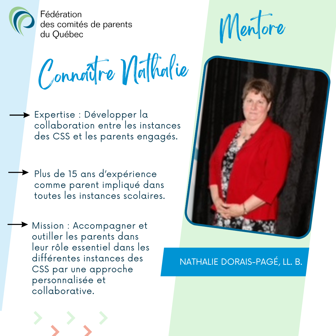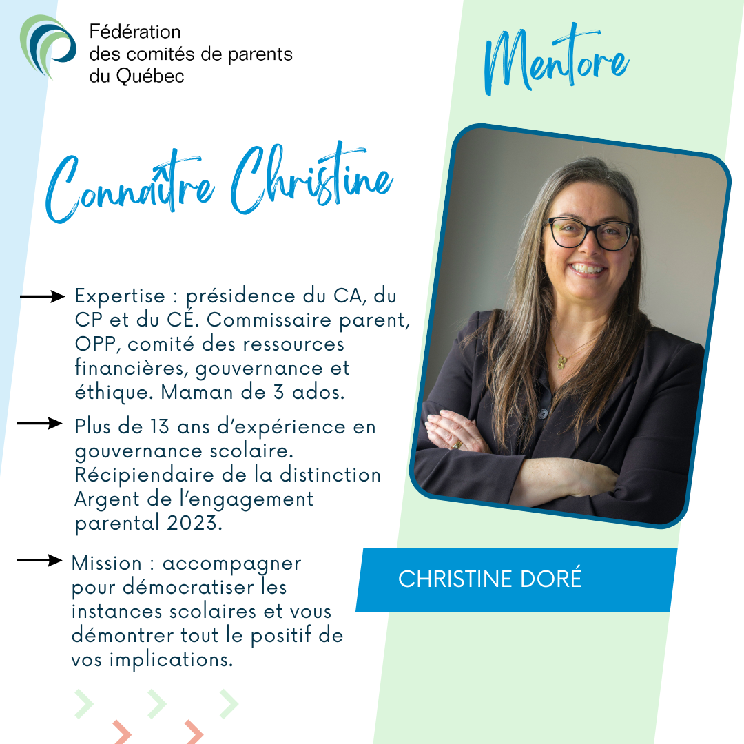 Notre équipe de formation est disponible pour offrir des mini-conférences, ateliers interactifs et formations aux comités de parents et conseils d’établissement. Notre équipe de mentorat accompagne les comités de parents membres de la FCPQ dans l’exercice de leurs sept fonctions prévues par la Loi.