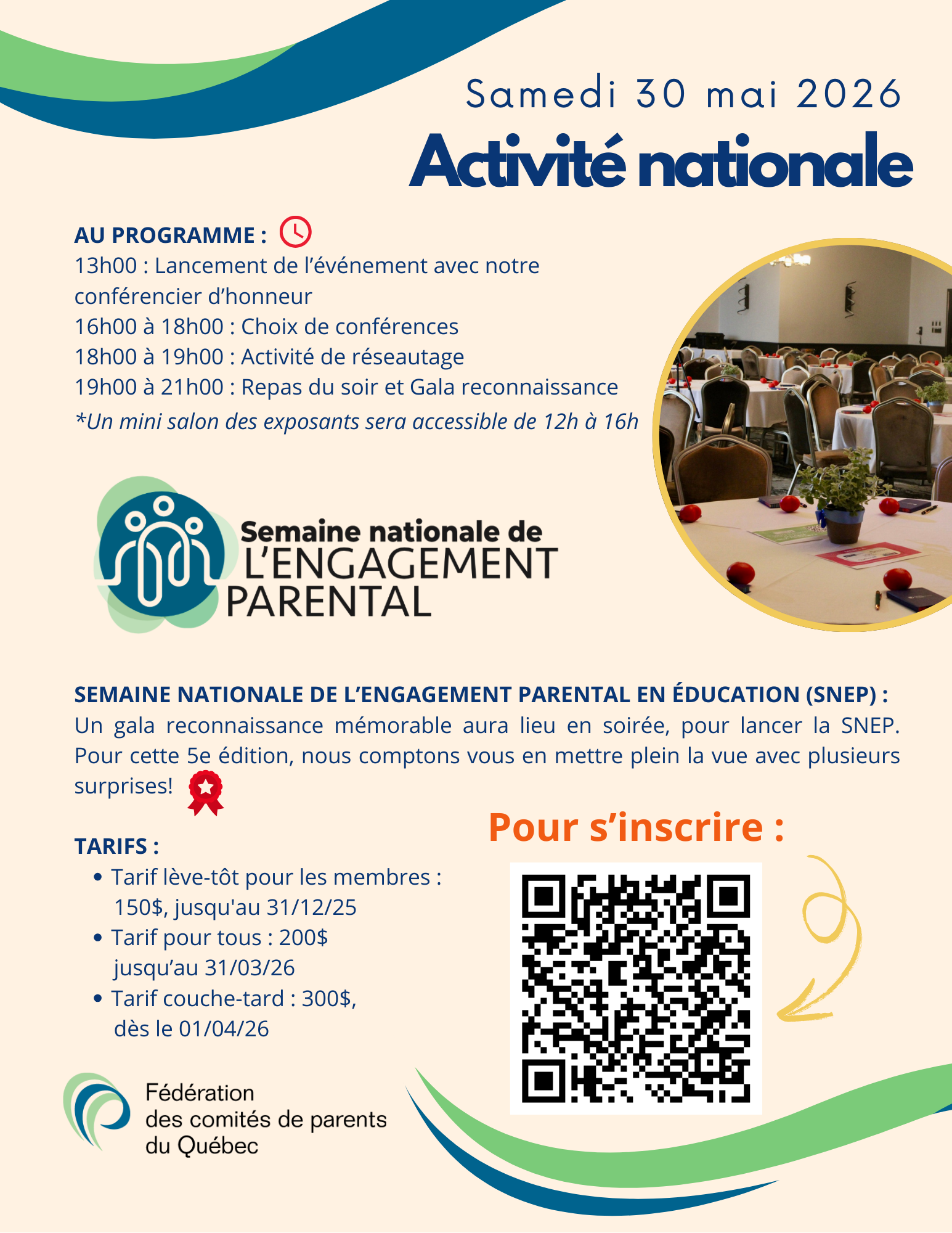 Cette année, participez à l’Activité nationale de la FCPQ, un rendez-vous incontournable qui va bien au-delà d’un simple événement! C’est l’occasion de rassembler des centaines de parents engagés, de célébrer la fin de l’année scolaire et de souligner concrètement l’importance de l’implication bénévole des parents au sein des instances de gouvernance scolaire.